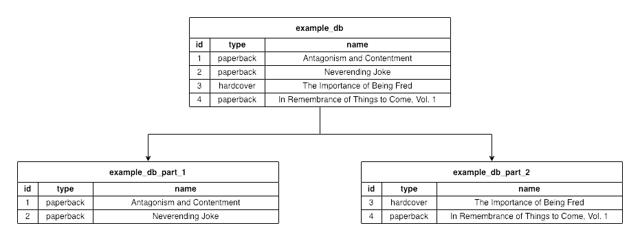 Here, the initial database (example_db) gets partitioned into two databases (example_db_part_1 and example_db_part_2). Each partition, or “shard”, gets some rows from the initial database.